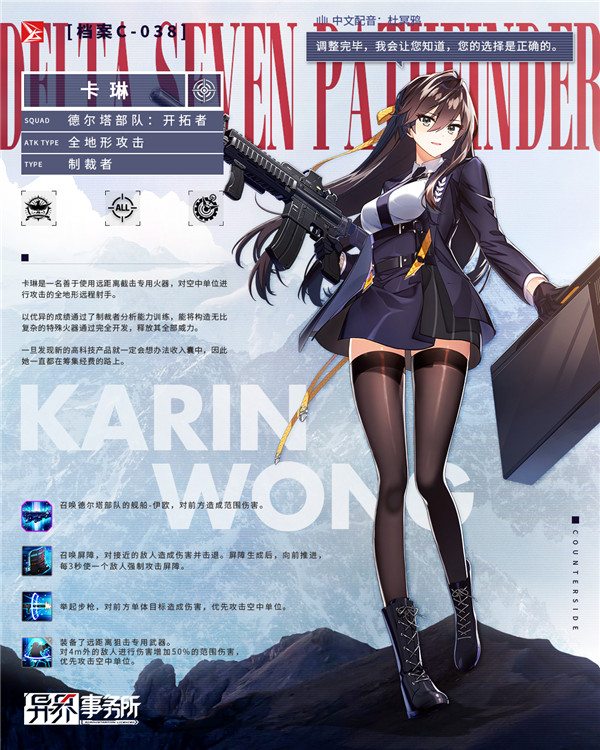 卡琳为4费狙击手,被动技能为普攻4m以外的敌人时,追加50%范围伤害,且对空特化。特殊技召唤一睹向前推进的防御墙,一会儿嘲讽一会儿击飞。必杀技为单纯的大范围伤害技。这个角色的伤害主要靠被动追加的范围伤害炸出来的,其范围伤害与对空特化能力是卡琳作为狙击手的一大特色,在面对大量的前锋单位与将来高贵的空中敌人时会有奇效。卡琳召唤的防御墙虽然没有凯尔的大小墙那么有用,但也能为前排减轻很多承伤压力,她在PVE、PVP中都算是个表现不错的狙击手。