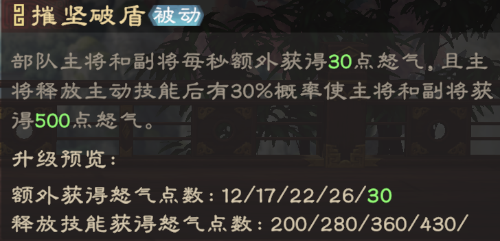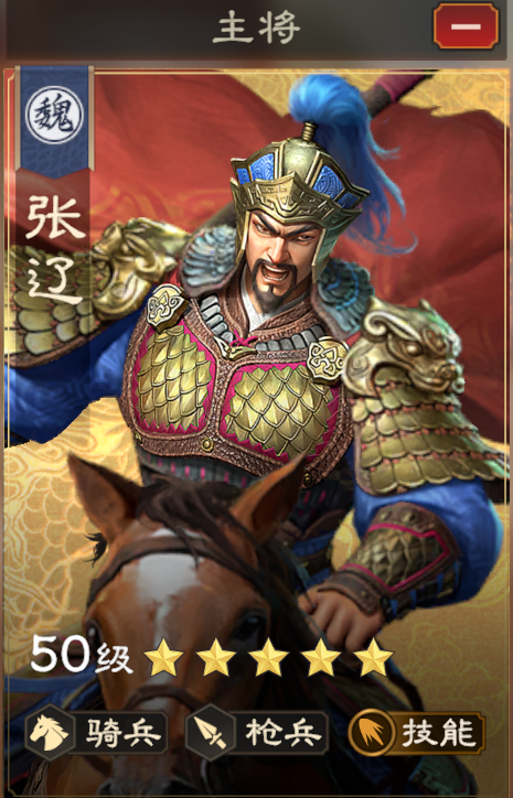 张辽自身被动,作为主将释放后可让主将和副将有概率获得500点怒气,配合“出其不意”+自身作为主将,可大大提升技能循环。