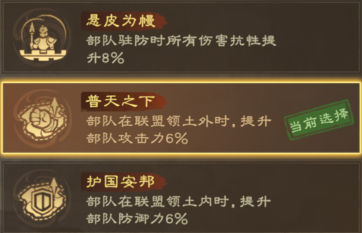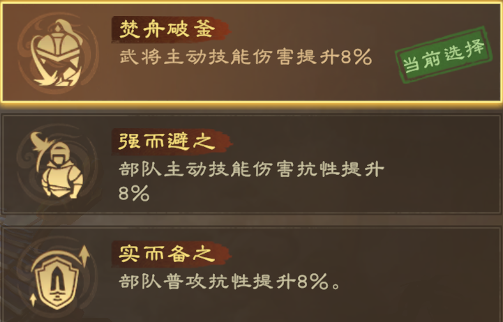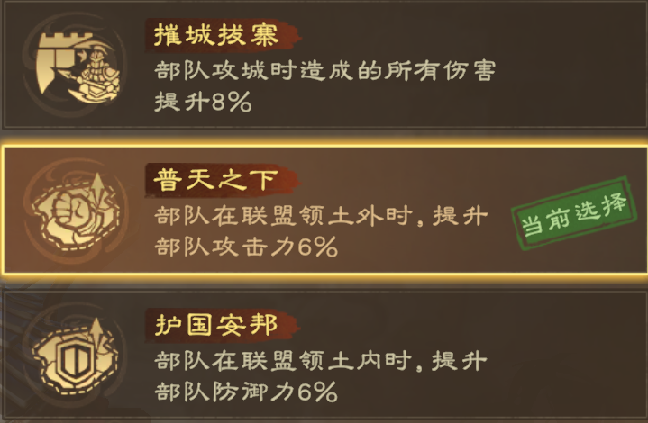 吕布同理,不要选择“摧城拔寨”。一般进攻选择“普天之下”,防守选择“护国安邦”。同时注意吕布和张辽要同时在“普天之下”或者“护国安邦”选择上要同步。