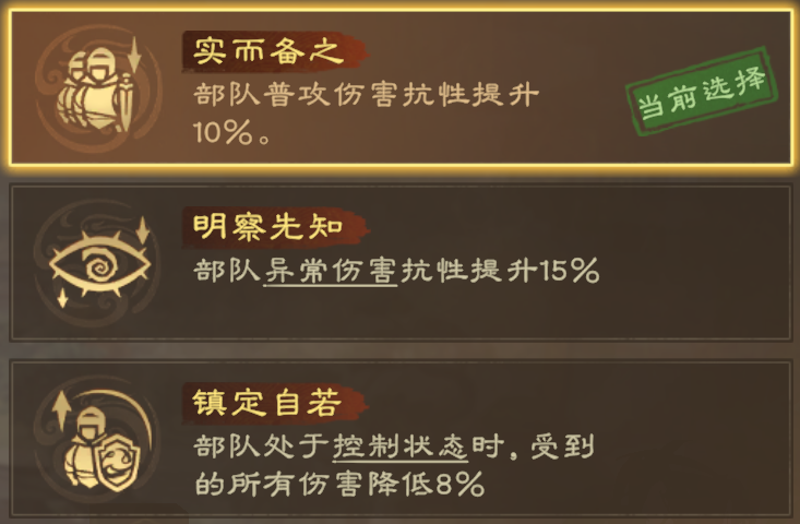 张辽天赋如下。此处注意,PVE由于面对盾兵时,盾兵往往为异常类伤害,需要选择“明察先知”。而PVP时,张辽一般用于针对普攻队伍,因此选择“实而备之”。