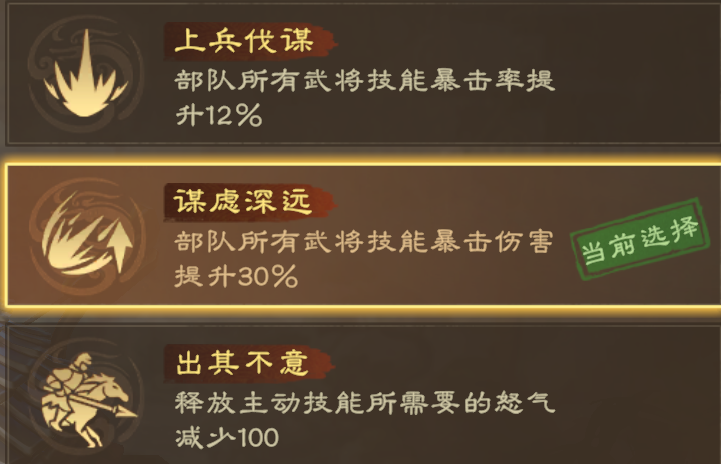 吕布作为副将,一般而言会选择“谋虑深远”提升全队的输出上限,当自身培养较低,暴击率不够时,也可选择“上兵伐谋”。