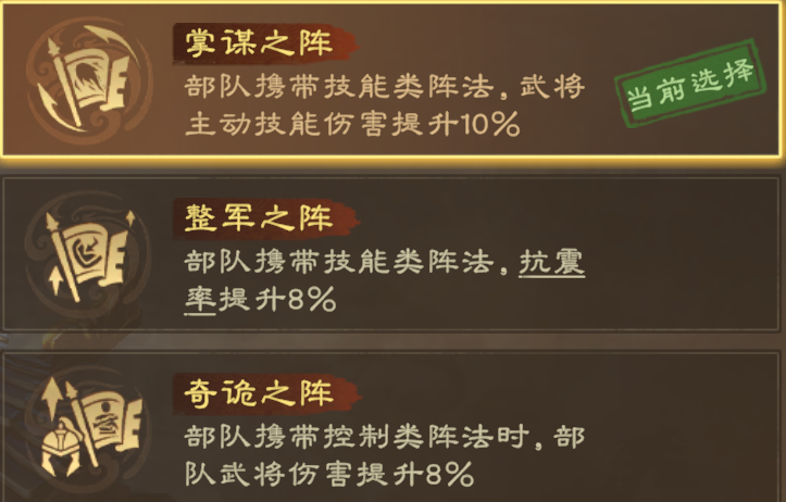 张辽天赋如下,由于一般都是携带双龙阵,为技能类阵法,因此选择“掌谋之阵”。除非特殊情况,对面反震率特别高,则需要选择“整军之阵”。