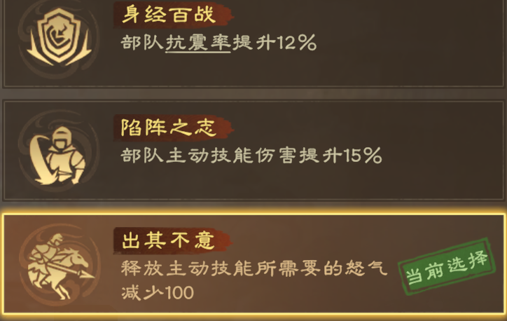 张辽作为主将,需要配合自身被动技能频繁加快全队循环,因此需要选择“出其不意”。
