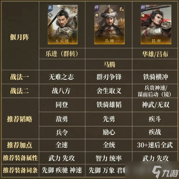 此战法可配合吕布或华雄为核心,搭配追击核心辅助武将马腾,第三个武将可考虑使用陈宫,或通过「征辟令」转为群势力的乐进,组成一队兵刃追击队;