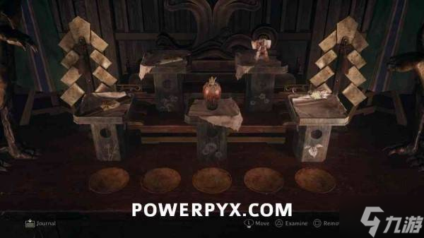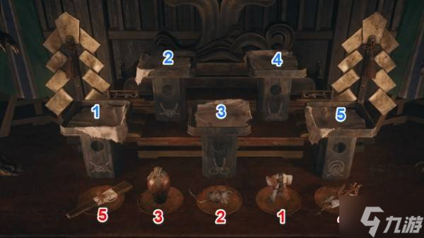 需要将5件贡品按照正确顺序放在祭坛底座上,每个底座都有一个绳结图案,可以按△键检查。