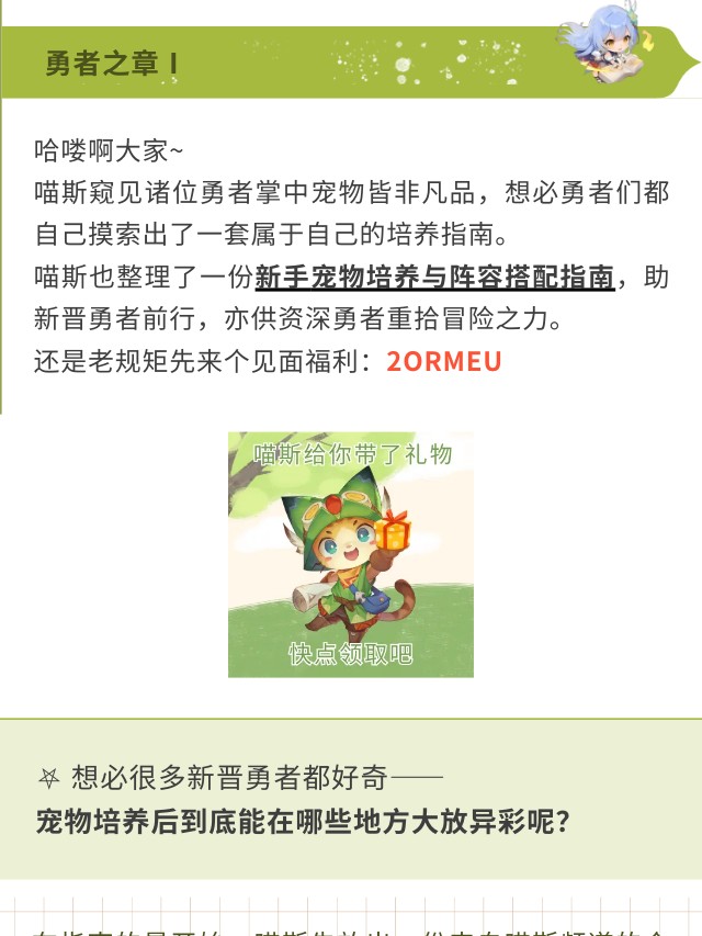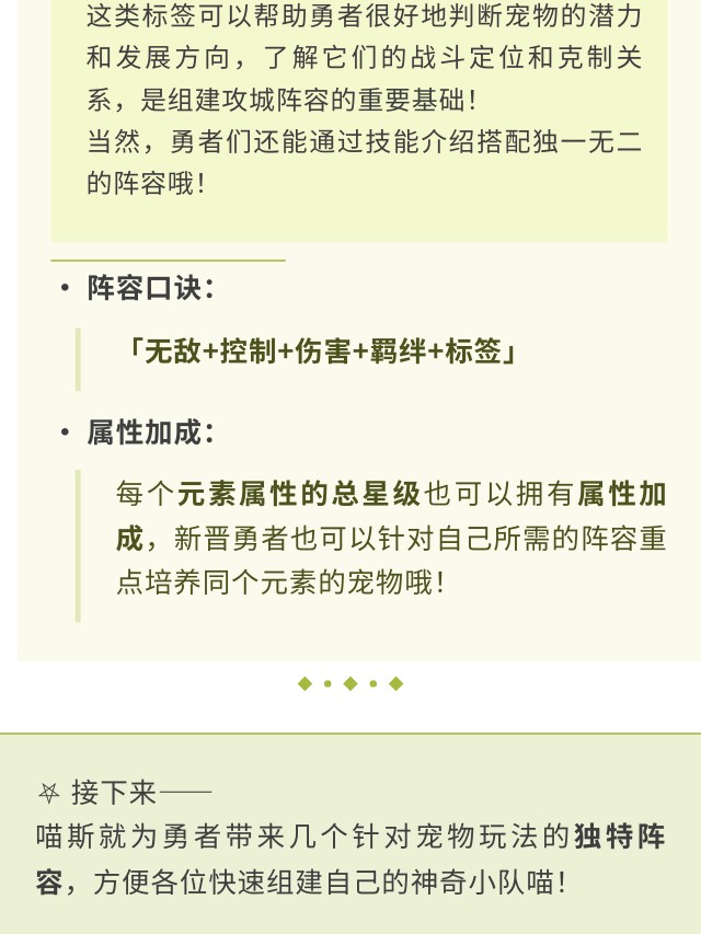 喵斯也整理了一份新手宠物培养与阵容搭配指南,助新晋勇者前行,亦供资深勇者重拾冒险之力。