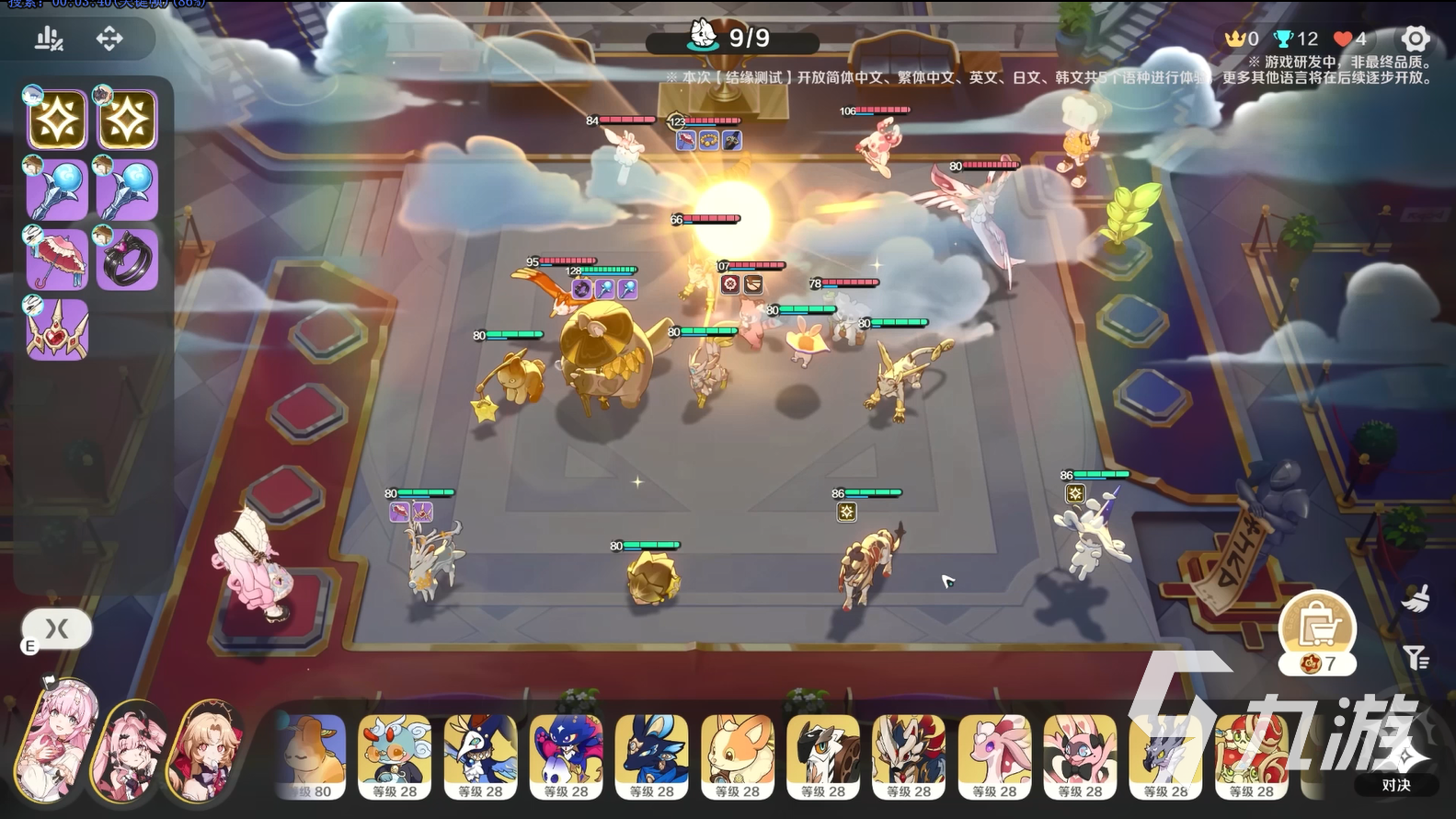 从现有的战斗场景展示来看,整体视角为俯视角度,镜头自半空中向下俯瞰战场。界面左侧设有多个功能图标,而战斗模式实际上采用了“自走棋”机制。值得注意的是,在精灵图鉴中并未出现火、草、水等传统元素分类,取而代之的是名为“元理”的设定。
