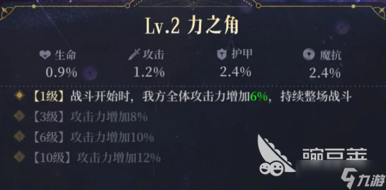 第四个图腾为大家推荐力之角,这个图腾主要是给全体的成员带来一定的增益,增益体现在增伤的属性上面,而且这个属性提升的数值是整场战斗都会生效的,所以在需要一定伤害数值的时候,可以使用这个图腾来搭配,而且增伤最高的数值是可以达到12%的提升效果,一般来说搭配这个图腾的情况有很多,所以是新手时期可以给很多角色搭配的图腾,可用度很高,而除了搭配这些图腾之外,大家收集到的这些图腾也是可以一起激活的。