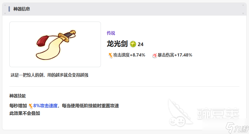 第一个为大家推荐的神器叫做龙光剑,龙光剑是一个可以给攻击类角色使用的神器,这个神器在属性方面带来的提升,是体现在攻速和暴击加成上面的,在效果上,它可以在攻击敌人之后提升自己的攻速,不过这个攻速是按照生效的秒数里面才可以提升的,最多带来的攻速提升数值达到了8%的数值。