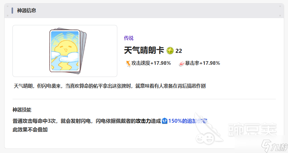 第四个神器叫做天气晴朗卡,带来的攻速以及暴击概率加成比较高,这里大家如果拥有攻击命中3次的效果的话,那么在后面还可以连续发射一个闪电,带来一次最佳攻击的能力。