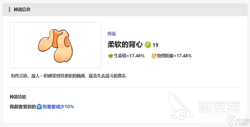 第6件神器为大家推荐柔软的背心,这个神器本身是适合给一些辅助类角色使用的,因为它主要的加成是放在生命值以及物理防御属性加成上面的,所以在技能上面使用的话,可以减少对面受到的伤害数值,也是会有很强的抵御效果。