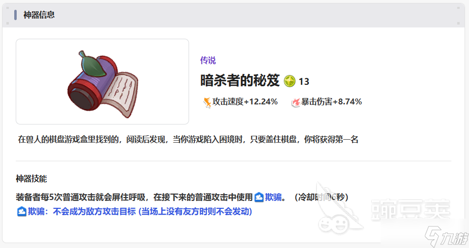 第2个神器叫做暗杀者的秘籍,这个神器目前也是带有一定攻速提升效果的,但是另外的效果上面是在暴击伤害属性当中,装备之后带有一定的加成效果,所以拥有的装备在攻击的时候,次数只要达到5次的话,那么此时就会给到一次欺骗的效果施加给敌人,欺骗的这个效果的用处还是比较多的。