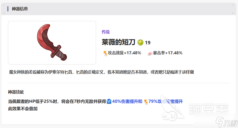 第三个神器为大家推荐叫做莱薇的短刀,这个神器在攻速有一定提升之后,还可以给角色的暴击属性都带来一定的数值加成,在效果上面,大家可以根据目前血量的数值来操作,因为只要是在血量状态低于25%的时候,这个神器就会给大家增添无敌的效果,无敌状态会一共持续几秒时间,在这个无敌状态之内,角色的伤害会有40%的提升,并且在攻速上面达到最高的提升效果会达到79%的数值,这个数值比很多的角色在技能的提升数值上面要高了。