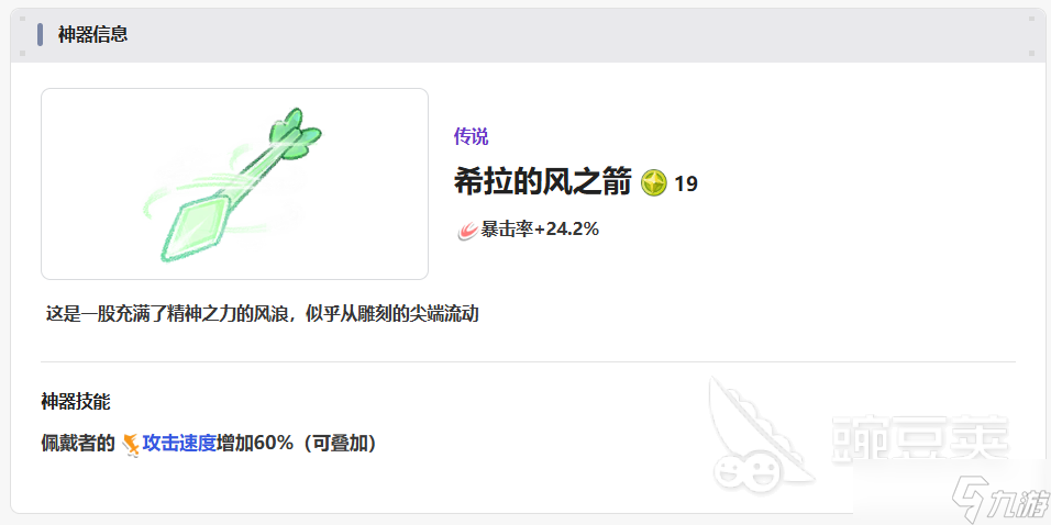 第5个神器叫做希拉的风之箭,这个神器更适合一些风属性的角色使用,装备这个神器带来的暴击属性加成是非常不错的,因为这里还有60%的攻速加成效果,所以叠加起来的话,大家走暴击流是非常适合的。