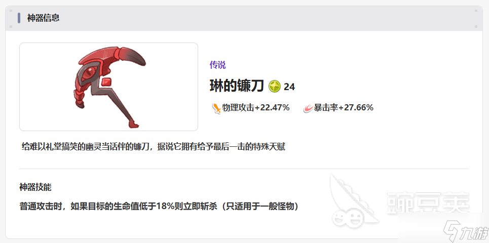 第9个神器为大家推荐的是琳的镰刀,这个神器是给物理系角色使用会比较好,因为带来的物理攻击力提升效果比较强,而在暴击率加成上面,也是比较适合物理流派使用的,而在使用这个神器拥有的普攻攻击,也是会带有一定额外的效果,这一点体现在斩杀的能力上面,如果敌方有18%的血量的话,那么此时使用斩杀这个概率触发会比较大。