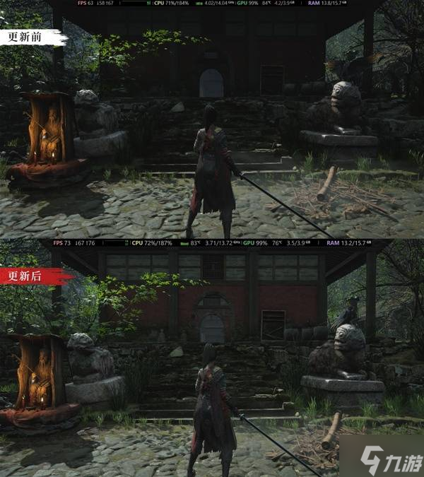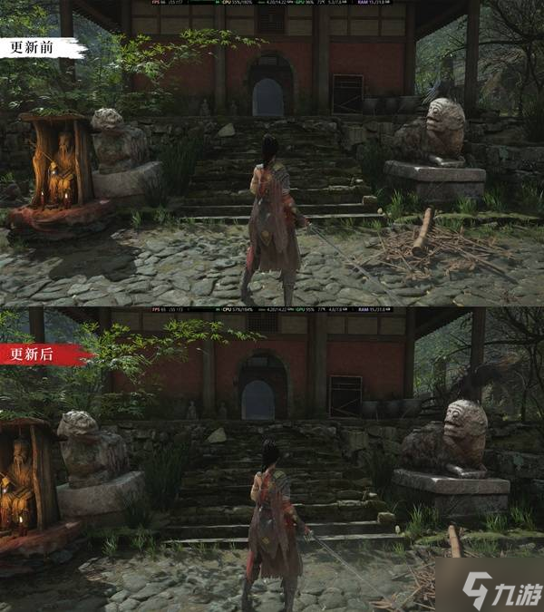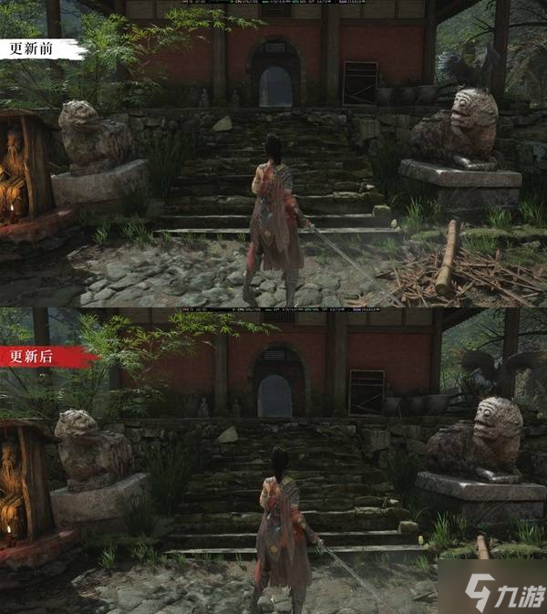 修正在DLSS极致性能档位,部分屏幕分辨率下,画面过糊的问题。下图为2K屏幕分辨率,前后对比图。