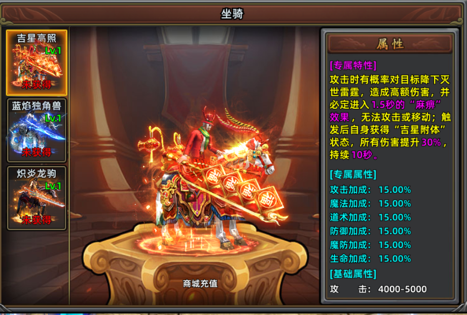 可通过精品粮草升阶您的初始坐骑,升级强力爽技!充值还可解锁多种化形,激活后可开启多套骑战装备,佩戴击杀坐骑BOSS 或通过乱古令牌合成所获得的战骑装备可获得强力属性,收集骑战套装更能整体提升坐骑属性,大幅提升玩家战力。每个化形有专属的独特技能,带给您砍瓜切菜般的体验!