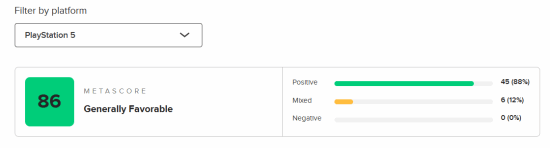 本作的M站媒体评价目前已经解禁,M站均分86分,截至目前,PS5版本收录49篇评测,43家好评,6家中评。PC版本均分88分,收录11家好评。XBOX版本暂未出分。(本文会针对评分情况持续更新)