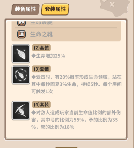 多个生命套装搭配后可获得高额的生命加成与回复深受勇士们最喜爱~