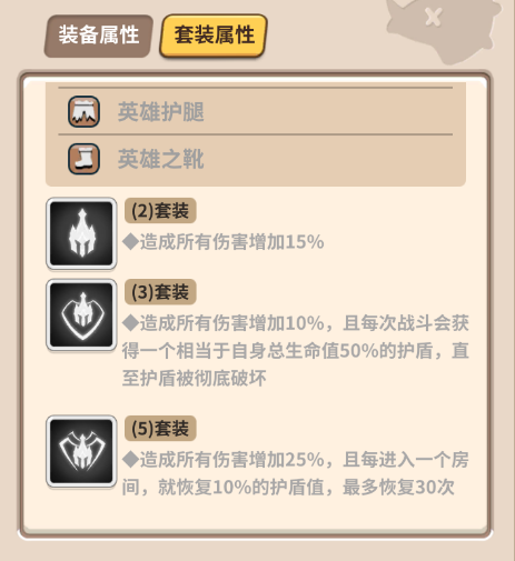 减少一件套装的效果触发套装属性有几率召唤一排神圣勇士为玩家抵挡300%的子弹攻击也是非常的不错的哦!!