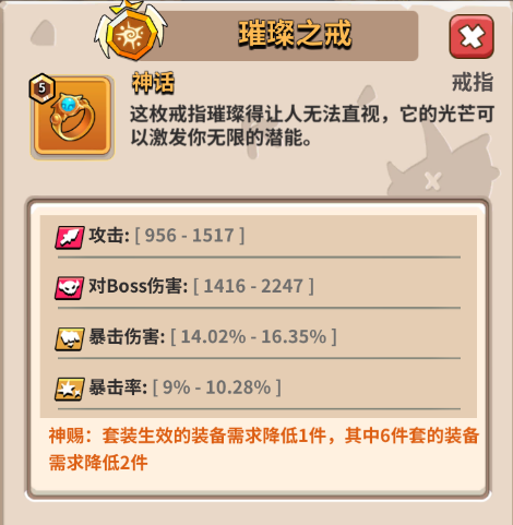 【璀璨之戒】可以减少套装的数量,穿戴上相当于勇士们就算手头只有一件套装但是依旧可获得两件套装的被动效果!!与复数的套装互相搭配可减少好几件套装成本且大大提升勇士自身的属性效果!!