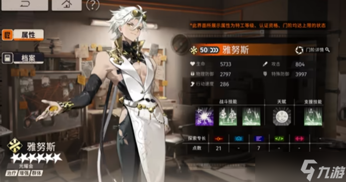 雅努斯是少见的拥有增伤和治疗辅助角色,可以提供大量暴击和持续治疗效果,解锁一门后能大幅提升增伤能力,他的所有技能都可以提供持续治疗效果,普攻能对选定目标造成单体伤害,生命值最低的队友会得到持续治疗。战术技是给选定队友提供百分之二十暴击率,并给血量最低的队友添加两层持续治疗,持续治疗能叠加,雅努斯很轻松就能给队友叠多层持续治疗。