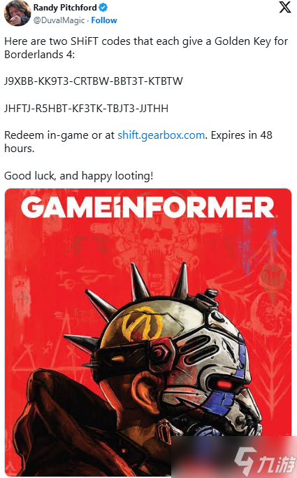 Gearbox首席执行官Randy Pitchford通过X平台公布了两组代码: