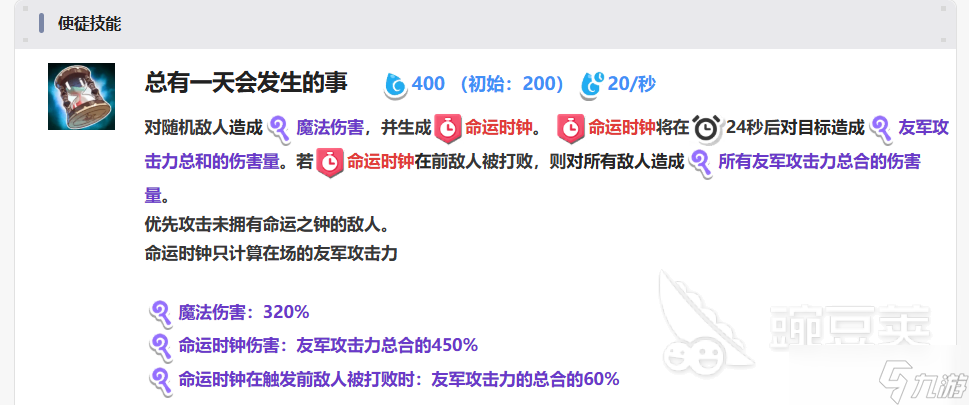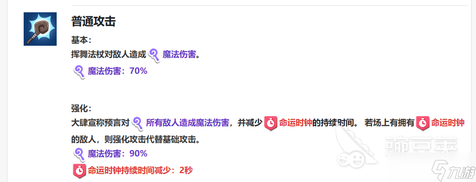 基础效果是没有额外的效果可以增加的,但是如果是使用强化效果的话,那么在上面使用强化技能的时候,可以对所有的敌人都带来魔法类型的伤害,并且减少此时命运之钟的冷却时间,如果场上此时还有一些之前增加过命运之钟印记的敌人,那么这个强化攻击则会直接代表基础攻击释放出来,这里带来的魔法伤害会比基础的攻击多20%,所以就是达到了魔法伤害90%的数值,这里带来的命运时钟持续减少时间只有两秒,虽然时间比较短,但是大家可以利用起来的连招还是有很多的。