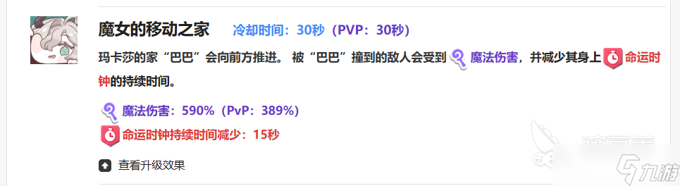 而玛卡莎的第二个技能叫做魔女的移动之家,这个技能冷却时间非常快,只有30秒,而且比较特殊的一点是跟其他角色的冷却机制不一样,很多角色的技能在推图以及PVP里面,冷却时间是不一样的,但是玛卡莎她在冷却时间上面。不管是参与推图还是PVP冷却时间上面都是30秒,所以这个冷却时间对玛卡莎来说,效率根据不同的场景产生的变化不会特别大,她的这个技能在使用的时候,她的家还会出现在场景中,她的家名字叫做巴巴,此时巴巴会向前努力的推进,只要是被巴巴撞到的敌人,受到的伤害都是魔法类型的伤害。