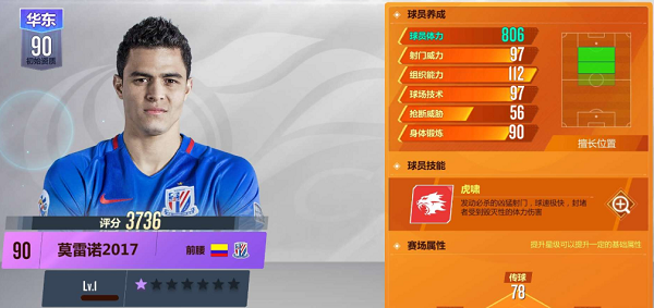 从位置上来说,前锋和前腰深绿,中前卫浅绿。虽然没什么大毛病,但是只有两个深绿位置,确实还是有些限制排兵布阵,个人感觉边路应该也可以胜任吧。再来看技能,虎啸,又是一个新出的技能,看名字很厉害的样子。看描述感觉和怒射和强袭差不多意思,但应该是升级版,毕竟是紫卡嘛。个人感觉,虽然莫队射门也比较势大力沉,但似乎可以有更适合他气质的技能,虎啸这类的,好像还是适合胡尔克。哇!突然想到,如果把同来自上海滩的莫雷诺(虎啸)胡尔克(怒射)阿瑙托维奇(强袭)同时放在前锋线上,三门大炮轮番轰炸,哪个门将能受得了这个呀。。。太可怕了!