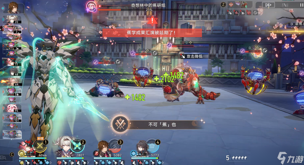 蕉研组的小怪拥有三种状态,一个是屏幕出现高兴的样子就是课间频道状态,这种形态下怪物会给我方提供能量恢复,一个是屏幕出现愤怒的样子就是课堂频道状态,这种形态下会对我方造成伤害并且减少我方的能量。通过攻击可以让怪物在这两种状态之间转换,当将怪物的弱点击破后会处于补课状态,屏幕上会出现乱码的效果。利用角色不断的攻击可以让怪物处于课间状态,能恢复我方的角色的能量,注意特殊的能量不能恢复,比如黄泉的大招、飞霄的大招等。中间的精英怪在对其攻击6次后会进入强化状态,这时会对我方全体造成大量伤害,再经过6次攻击之后会退出这个状态。