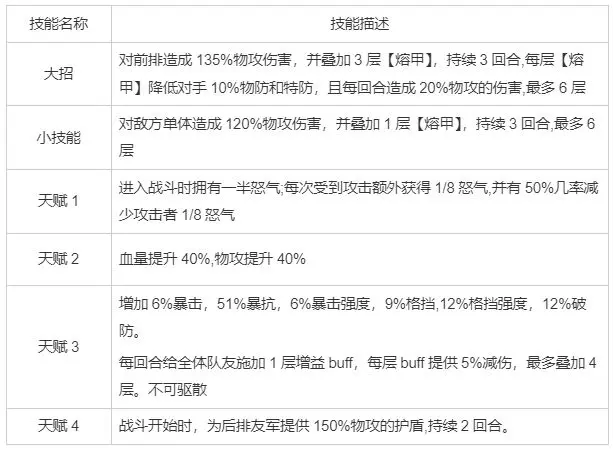 火炎朱雀,火系SSR精灵,以群伤减甲为战场角色。其大招不仅对前排敌人进行物理伤害,还能施加【熔甲】效果,降低敌人的物防和特防,同时造成持续伤害。小技能亦能对单一目标叠加【熔甲】,强化减甲功能。天赋允许它半怒气开局,提升怒气获取速度和干扰敌人怒气。血量和物攻得到显著加成,提高生存及攻击能力。其他天赋则强化了全队的减伤能力,给全体队友施加不可驱散的增益buff,以及战斗初期给予后排友军显著的护盾,均提升了队伍的整体防御力。