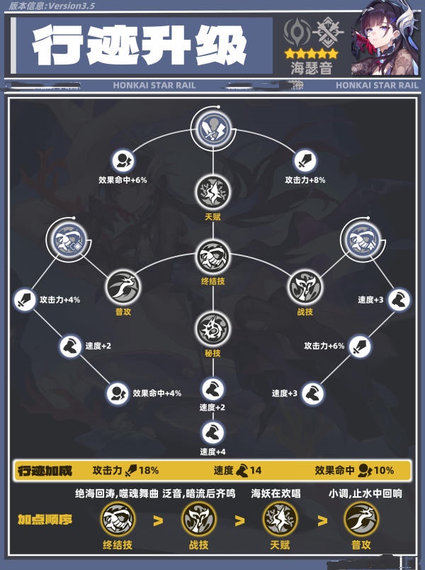 行迹加点直接影响角色实战强度,海瑟音加点优先级为:终结技>战技>天赋>普攻。