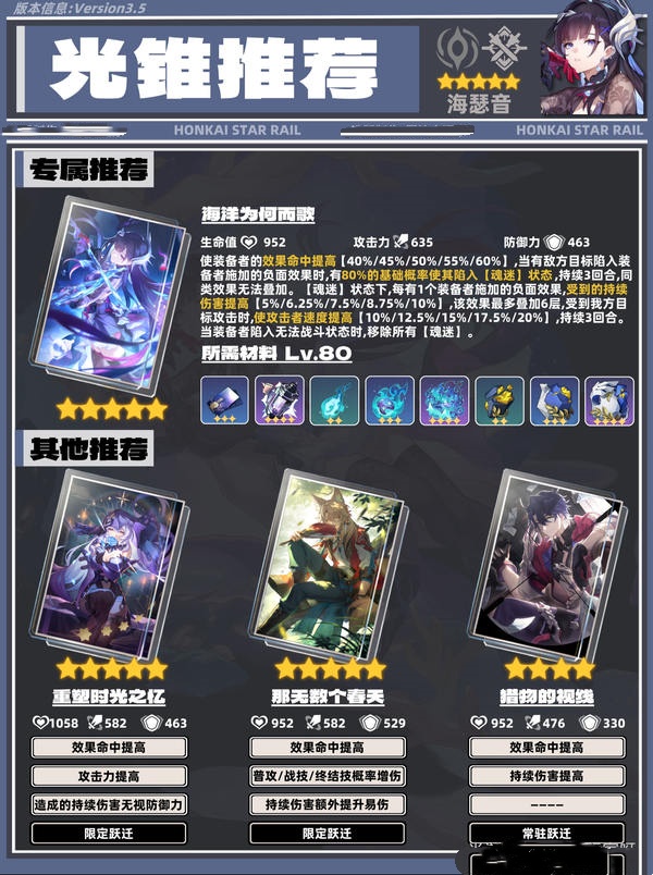 1.专属光锥-海洋为何而歌:与海瑟音技能机制契合度极高,提供的属性加成能有效提升其伤害输出,专属效果更是进一步强化持续伤害能力,无疑是最佳选择。