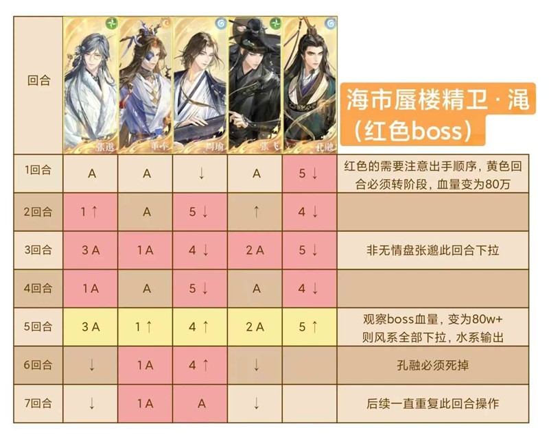 表格里基本都标注了,我的张飞忘了切换命盘,有断桥伤害应该会更高,需要注意不能提前把boss打进二阶段(张飞张邈防御,在第五回合打进二阶段)
