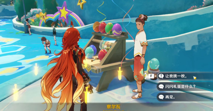 3.咔阿夏赠与的闪闪礼蛋:获取这颗礼蛋的前置条件是完成世界任务邂逅总在悠闲时。在完成该任务后的现实时间第二天,玩家前往特定的红色星标所示传送锚点,在传送锚点旁边的房子门口与欧洛伦和伊法对话,即可接取欢聚总在寻觅后这个任务。