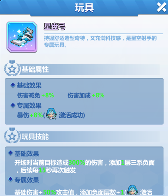 专属效果:暴伤+8%(满星24%)玩具技能基础效果:开场对当前目标造成300%的伤害,添加1层三系负面,后续每15秒再次触发专属效果:基础伤害+50%攻击值,添加负面层数+1