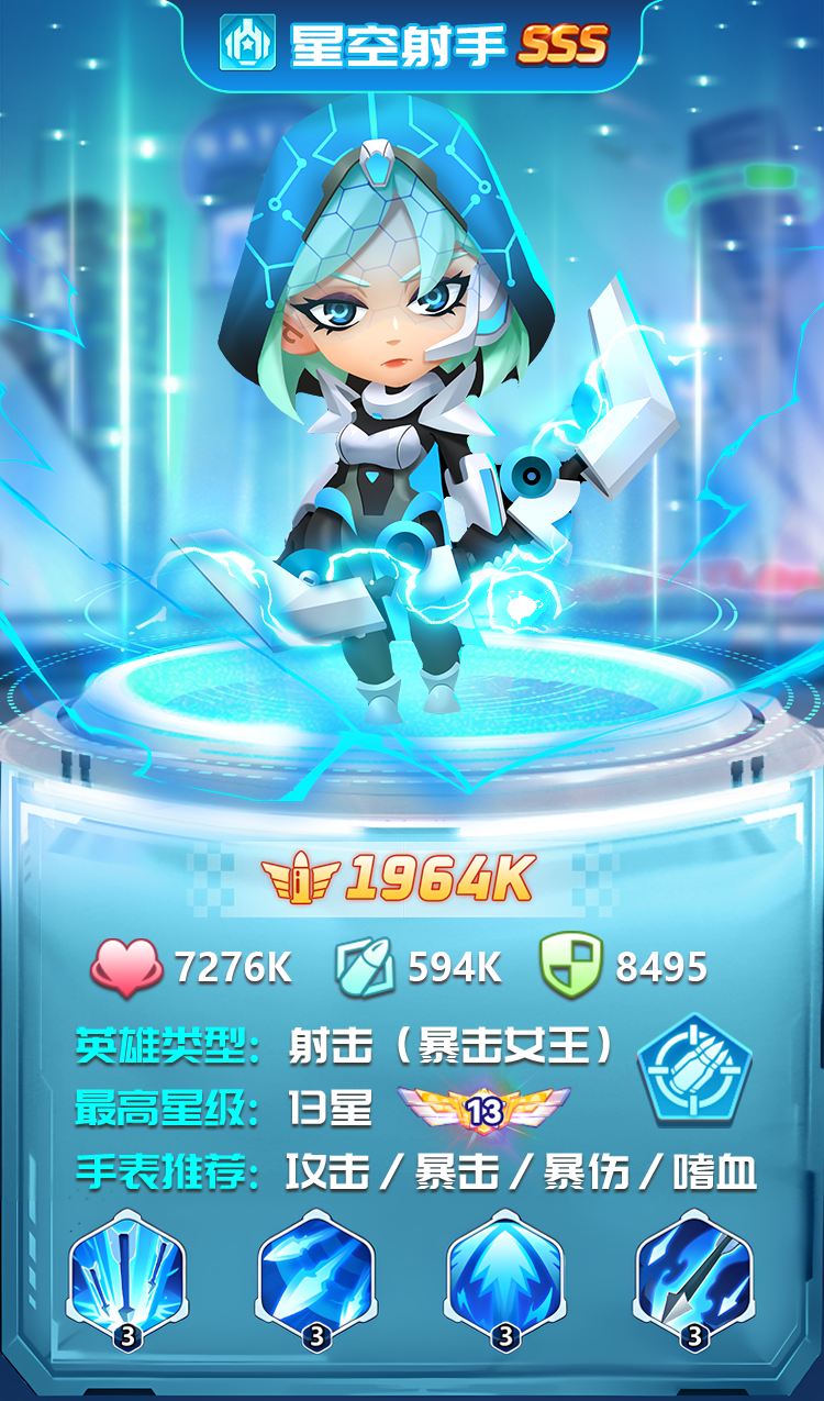 总体而言,星空射手的技能解读没有太多复杂的成分,主打一个高暴击高暴伤输出,通过技能伤害与出血效果对敌进行打击,是定位比较明确的射击英雄。与同为“出血流”的雷霆主宰搭配可以加快大出血伤害的触发,达成1+1>2的效果,如果已经拥有雷霆主宰作为队伍主力的指挥官,星空射手也会是你不错的选择。