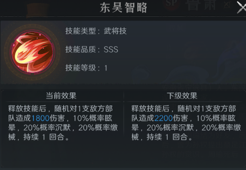 武将技能:可对单体目标造成伤害,并附带10%概率的眩晕效果,以及各20%概率的缴械(使目标无法普攻)和沉默(使目标无法释放技能)。虽然单次控制概率看似不高,但综合触发率可达50%,在战役和征途副本里可以多试几次,配合鲁肃反复挑战就能过关。