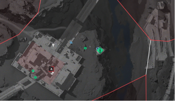 - 第一个任务点:位于A点右上方,通过绳索下滑后,在右侧的山洞中找到蓝标位置。