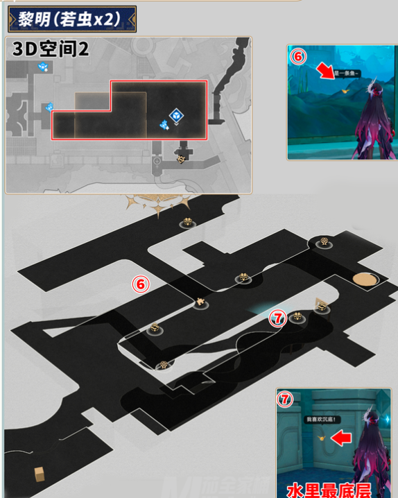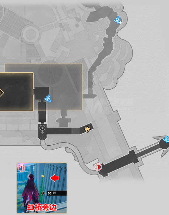 7.还是从宝库密道传送点出发,向北走,先乘坐电梯,再爬楼梯到达建筑物的最高点。利用雅努斯密径到达对面,转身再次使用雅努斯密径并切换方向至左下方传送过去,然后转身走过雅努斯密径,就能看到第七只若虫。在使用雅努斯密径的过程中,要注意路径选择和方向切换,避免出错。