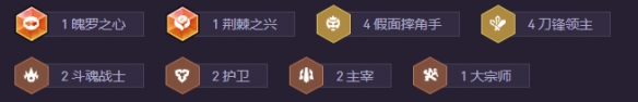 - 组合羁绊:1魄罗之心、1荆棘之兴、4假面、4刀锋、2斗魂、2护卫、2主宰、1大宗师。