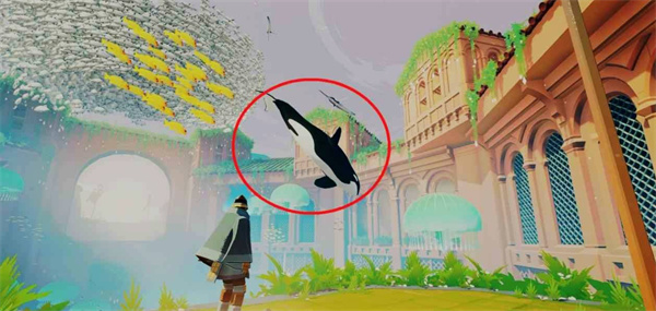 虎鲸:激活左侧锁链并使海水归位后,水域会出现鱼群和环绕游动的虎鲸。借助水母即可跳上虎鲸背部。