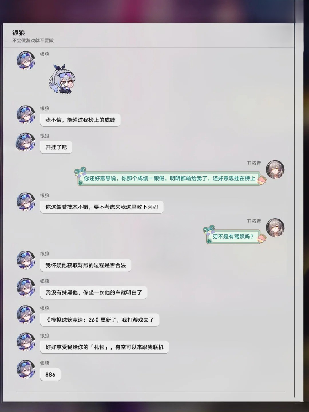 银狼会连续吐槽,质疑你的成绩真实性,并邀请你联机打游戏,还会吐槽阿刀的驾驶技术,暗示其驾照来源可疑。