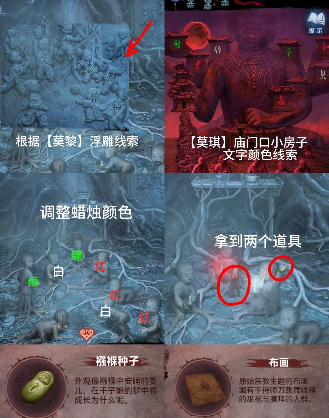 红色:进入左边石塔,点击右边桌子获得两个【泥塑头像】,点击左边无头佛像把泥塑头像都放上,根据姐姐边线索对应调整位置。