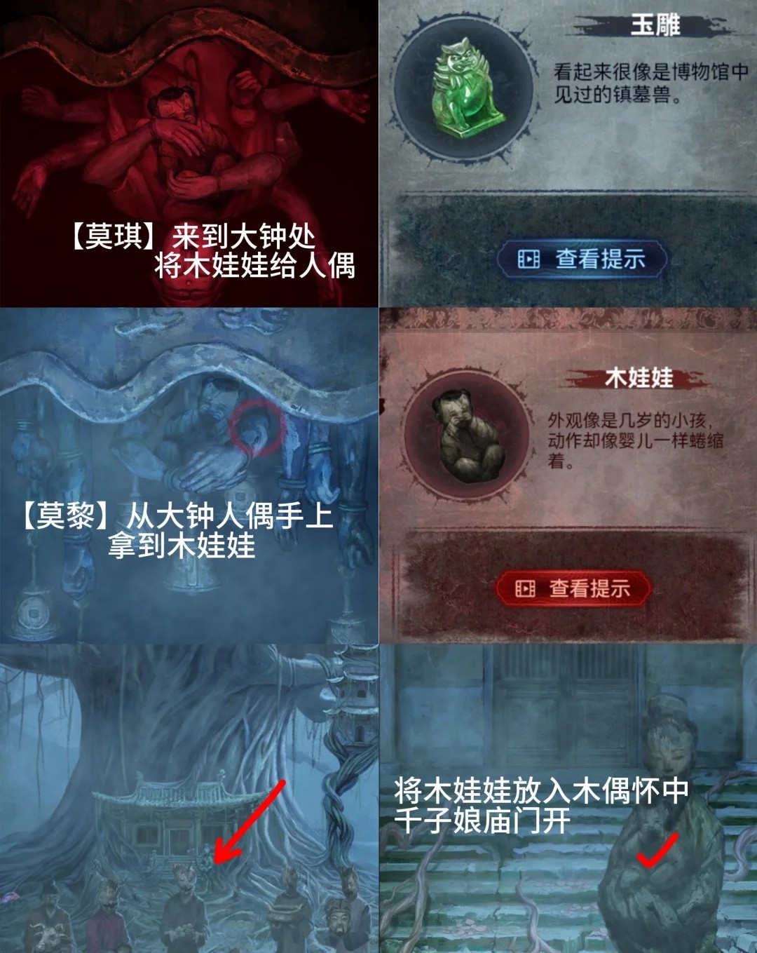6.红色:回到塔内点击钟,把木娃娃放入观音像怀里获得【玉雕】。