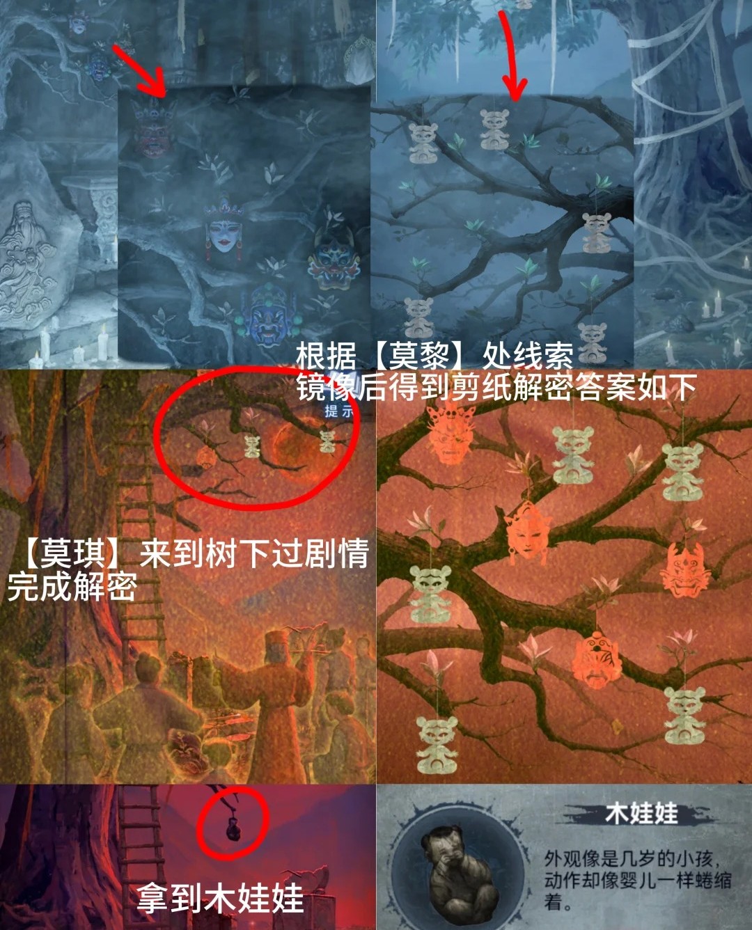 5.红色:回来到树处,完成小游戏(根据姐姐墙上的面具面具和树枝上剪纸提示调整)获得【木娃娃】。