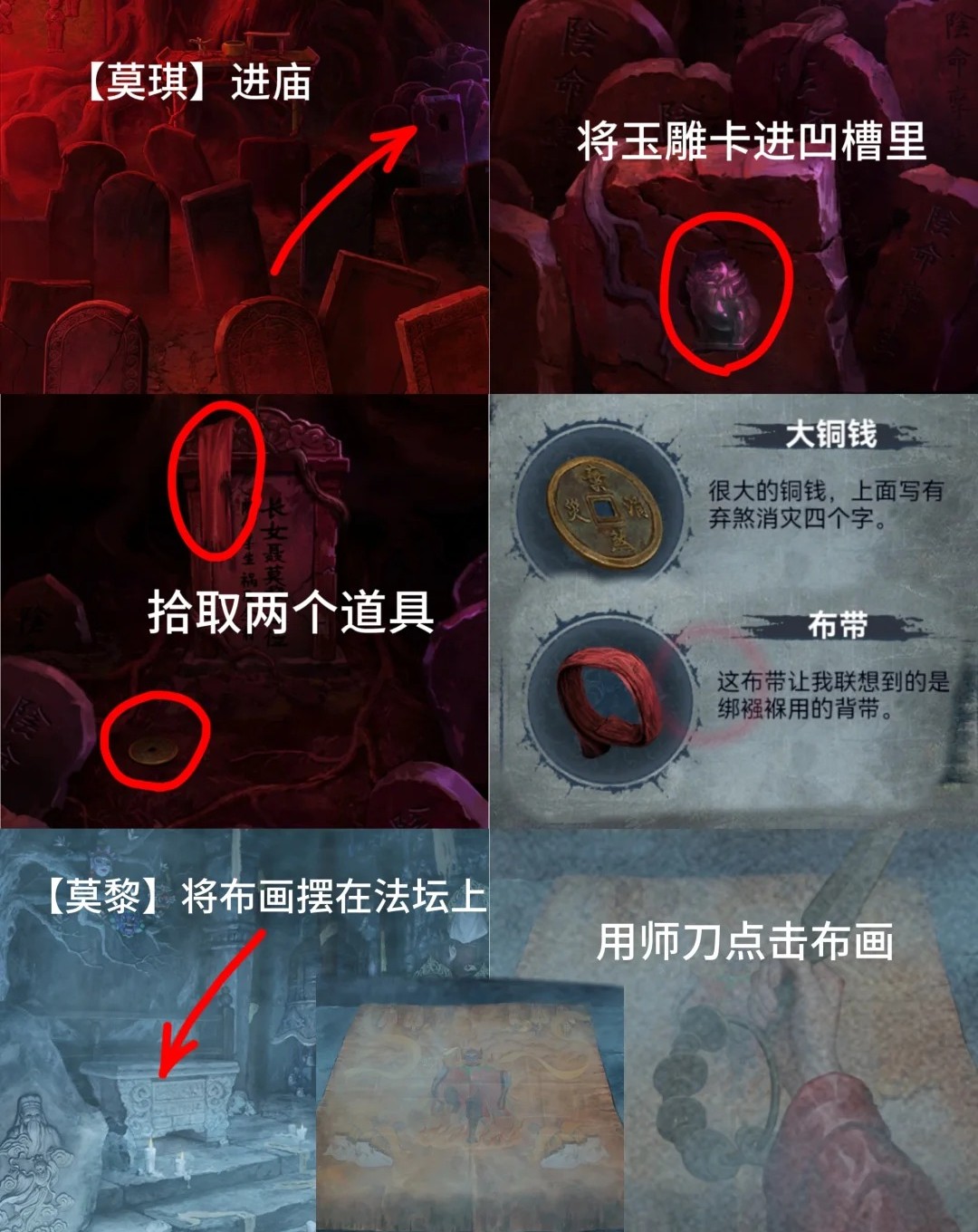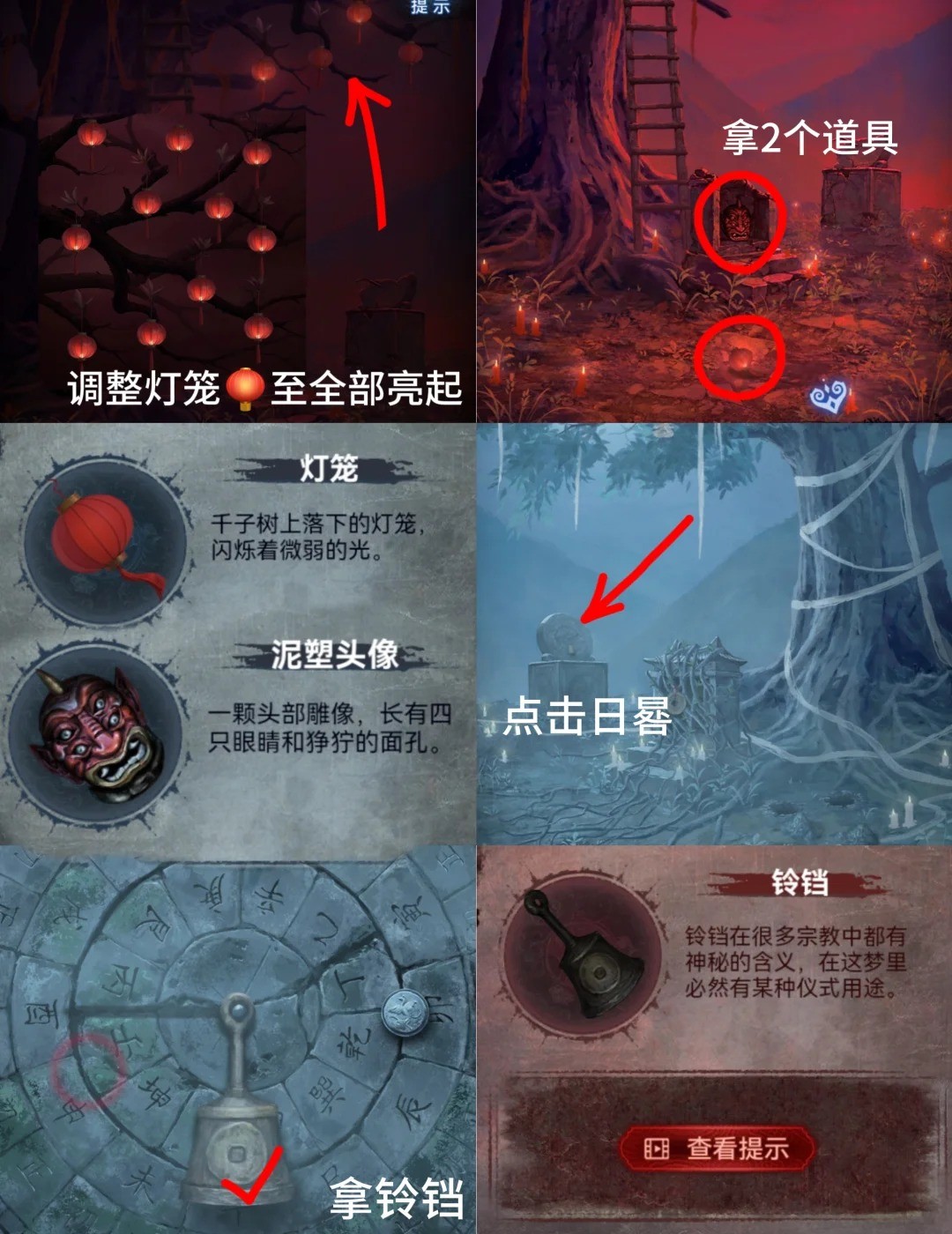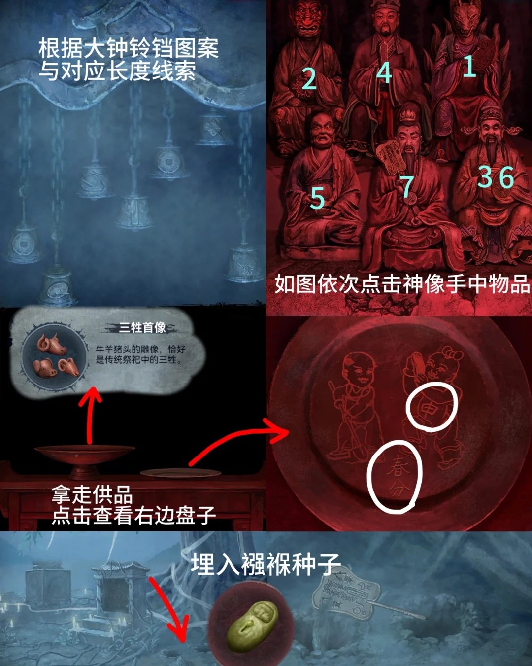 10.红色:进入塔内,点击左边佛像,使用大铜钱,根据之姐姐视角钟下铃铛线索点击,获得【三牲首像】和盘子图案线索。