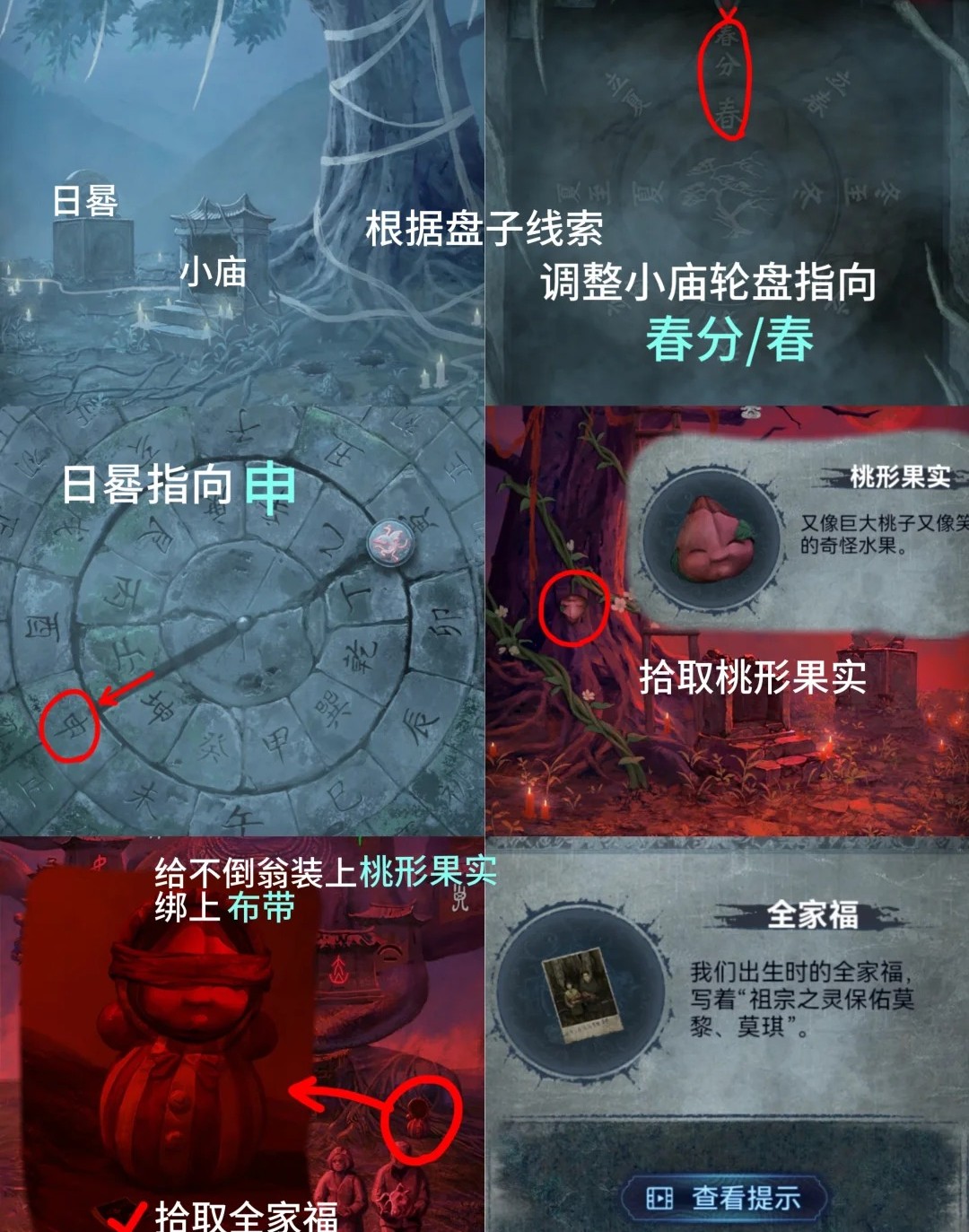 红色:回到大树处,拾取树上【桃形果实】,回到佛像处,点击右边不倒翁,放入桃形果实和布带,获得【全家福】。