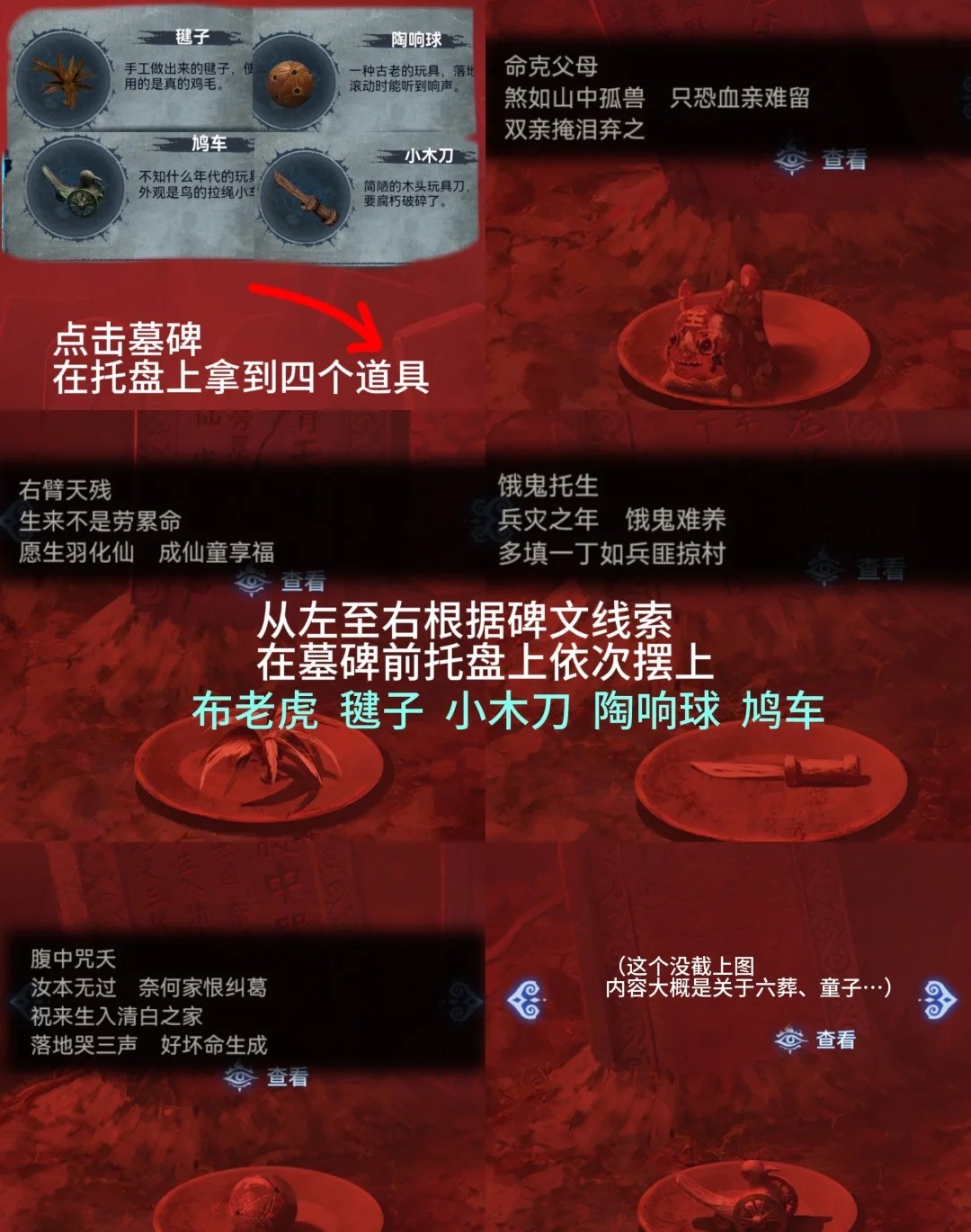 8.红色:进入中间小庙,获得【毽子】、【陶响球】、【鸠车】、【小木刀】,根据文字提示重新摆放(布老虎,毽子,木刀,陶响球,鸠车)。